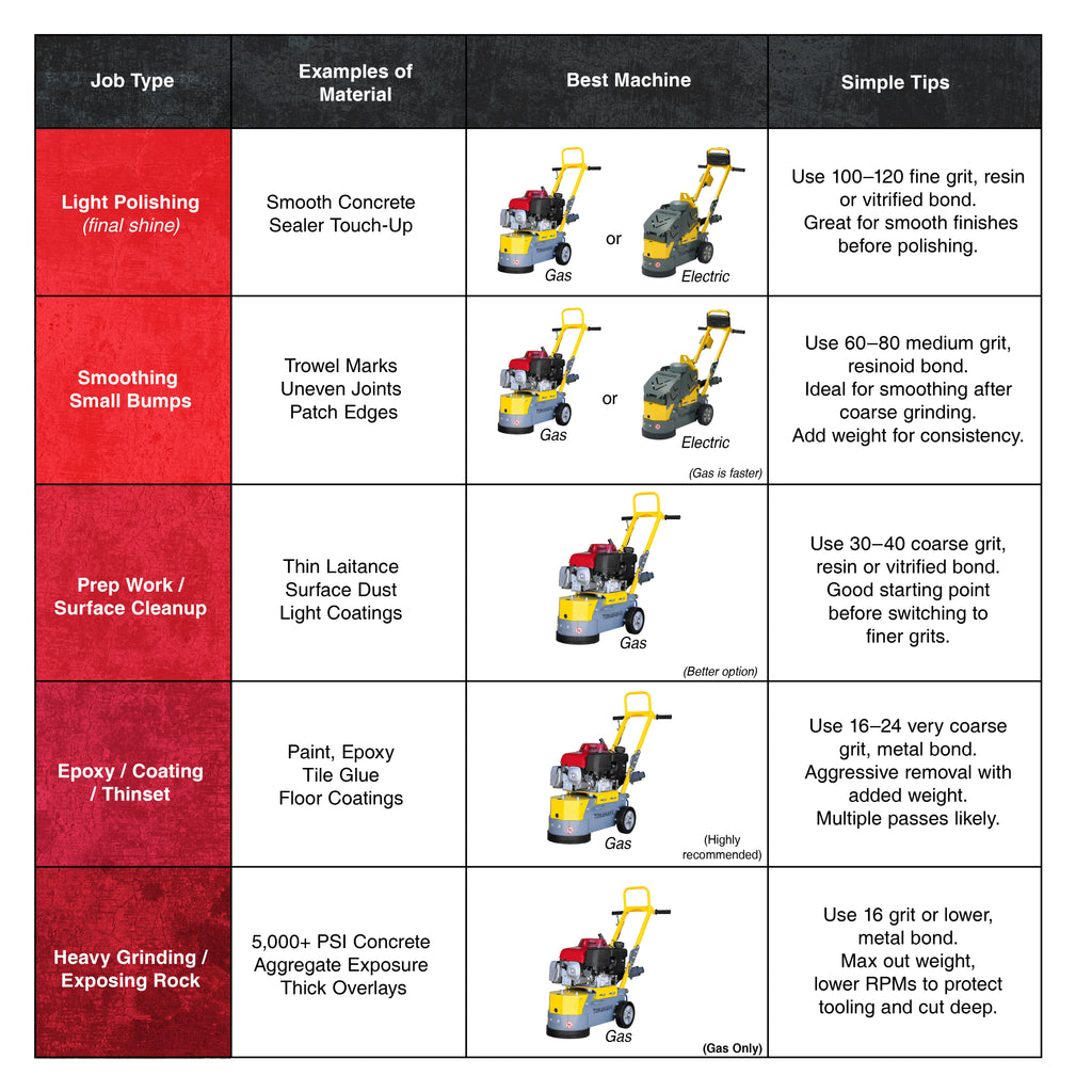 Grind off hardened coatings such as epoxy, polyurethane, paint, and sealers from garage floors, commercial warehouses, and shop slabs.