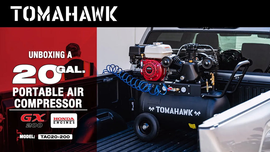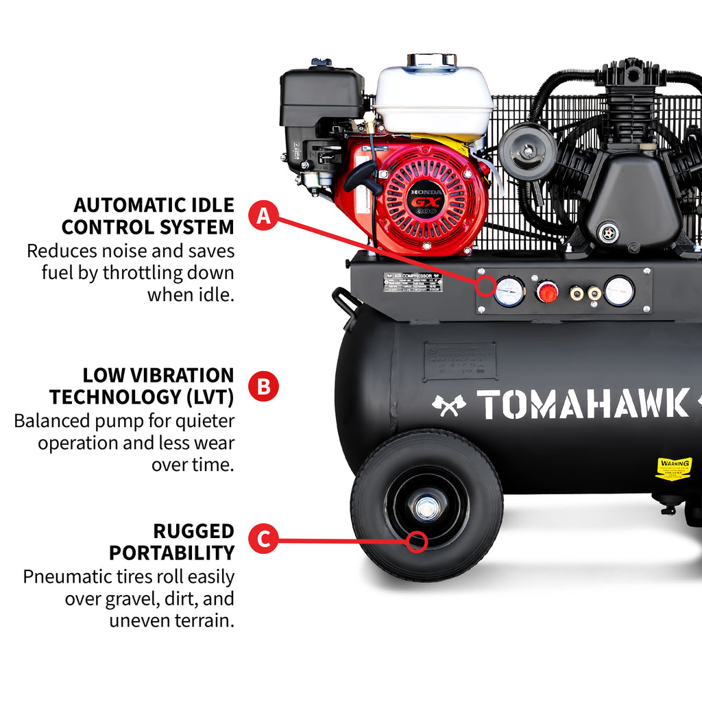 Power your tools anywhere with the Tomahawk Portable Air Compressors, built tough for contractors, framers, roofers, and pros who demand reliability on the go. Powered by a reliable 6.5HP Honda GX200 engine, this 20-gallon compressor delivers 13.5 CFM @ 90 PSI, making it perfect for air hammers, framing nailers, paint sprayers, and more.