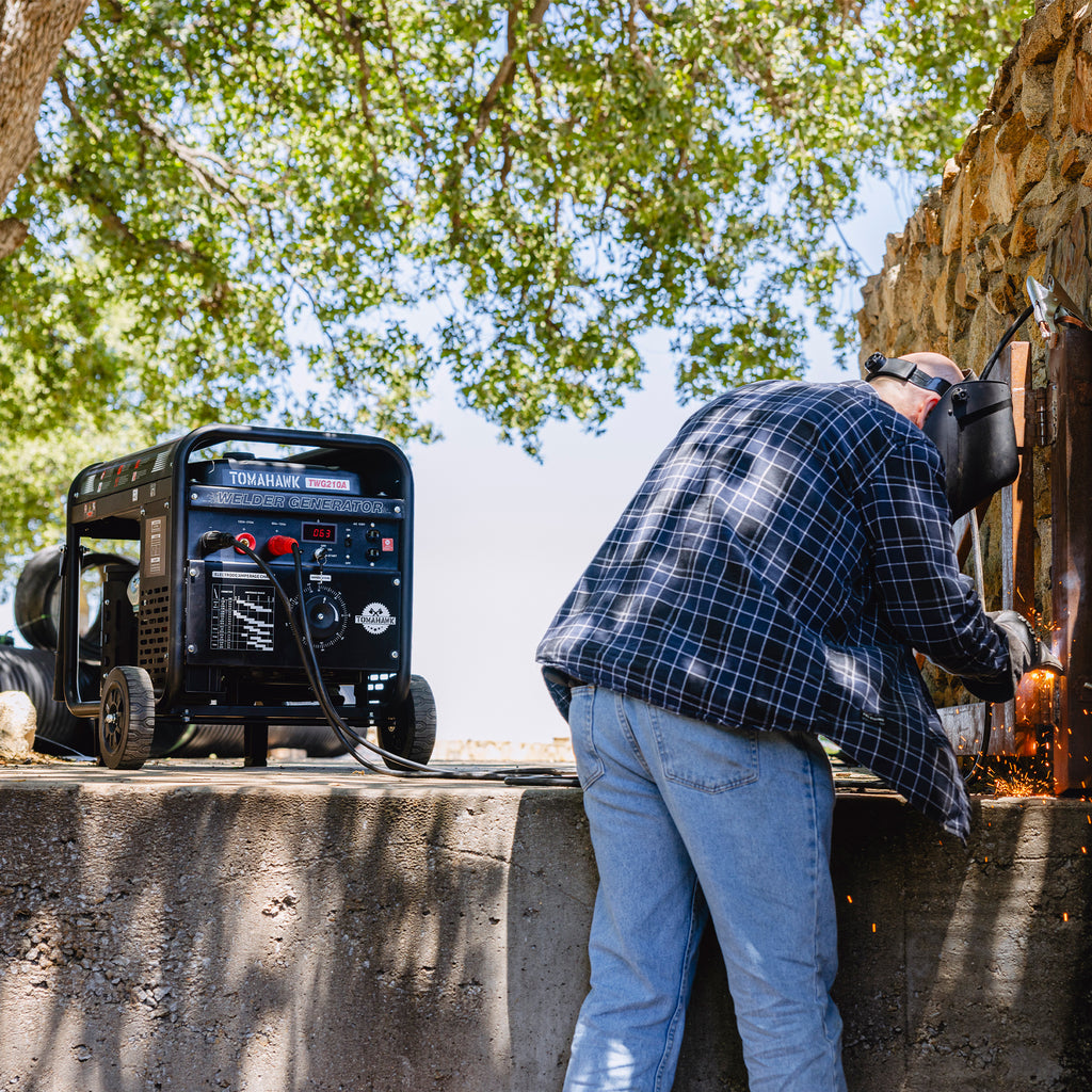 The Tomahawk TWG210A Generator / Welder is designed for high power and durability. Ideal for farms, construction sites, or any job that requires electrical power and CC (constant current) stick welding. Producing up to 210 Amps with a 60% duty cycle, it is suitable for welding from 6010 rods up to 7024 rods. Convenient back wheels allow for maneuverability for portable onsite welding and can also be used for emergency back-up power when necessary. Featuring Tomahawk’s incredible 15HP engine, with 2000 watts, this welder generator will provide you with the power you need wherever you need it. The Tomahawk TWG210A is an excellent tool for job applications at your workshop, ranch, or farm - and is backed by a 2-year engine warranty.
